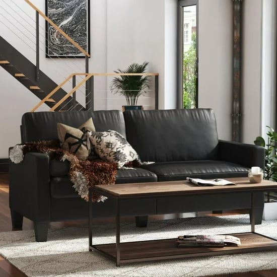 Elevate your living space with the sophisticated Furniture in Fashion Riga Faux Leather 2-Seater Sofa. Crafted with premium faux leather in a sleek black finish, this stylish sofa is designed to add a touch of modern elegance to any room. Its contemporary silhouette and luxurious upholstery make it the perfect focal point for your living area, whether youre entertaining guests or enjoying a quiet evening at home. The Riga sofa combines style and comfort with its plush seating and durable wood legs, providing both stability and aesthetic appeal. This versatile piece is perfect for small spaces, offering ample seating without overwhelming your room. With its chic design and practical functionality, the Furniture in Fashion Riga Faux Leather 2-Seater Sofa is the ultimate choice for anyone looking to enhance their home dcor. Transform your living room with the Furniture in Fashion Riga Faux Leather 2-Seater Sofa with Wood Legs in Black and enjoy the perfect combination of style, comfort, and practicality. Experience the ultimate in modern seating while enhancing your homes aesthetic appeal. FEATURES : Material : Faux Leather And Wood Finish : Black Upholstered in high-quality faux leather with a sleek black finish for a modern look Plush cushions provide support and comfort, ideal for relaxation and socializing Durable wood legs ensure stability and longevity, making it a reliable addition to your home Compact size is perfect for small living areas, apartments, or offices Blends seamlessly with various interior styles, from contemporary to classic Faux leather is simple to clean, ensuring a pristine appearance over time Comes with clear instructions for easy and hassle-free setup Inviting Aesthetic : The combination of black upholstery and wood legs creates a chic and inviting atmosphere Available at an affordable price Images shown are for illustration purpose only DIMENSIONS : Height : 889mm Width : 1829mm Depth : 825mm